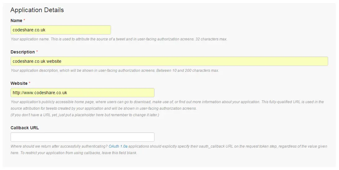 If you haven't done already, it will tell you that you need to add your mobile phone number to your twitter profile in the settings part of the main twitter site. I added my mobile number and unticked 'Let others find me by my mobile number' in the Security and privacy tab. - When you have created your app and click on the name to go into the application management screen, you need to click on the tab named Keys and Access Tokens. You will need to copy your Consumer Key and your Consumer Secret. I put these as app settings in my website. You shouldn't have them in your code.