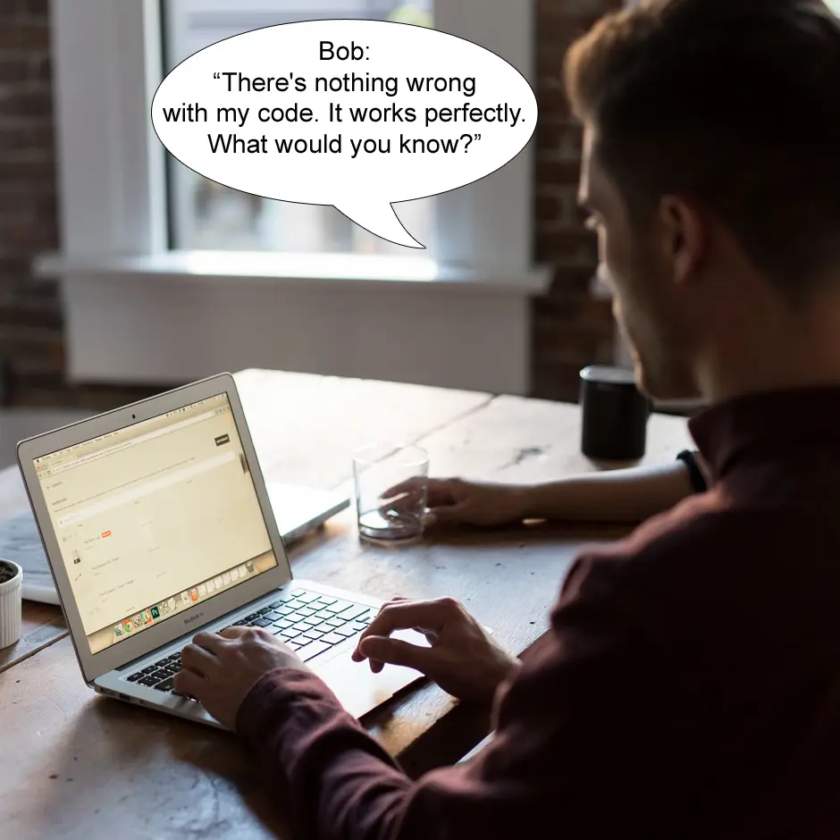 Denial is the first stage. Bob doesn't like being told where he has gone wrong. Especially in a code review. Bob is not good at receiving feedback.